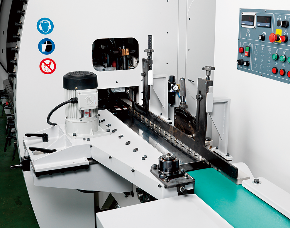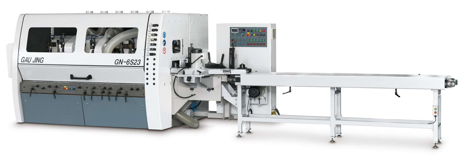 GAU JING GN Shortpiece series 4 side planer & moulder offer unbeatable accuracy and productivity designed for planing short pieces. The cast iron construction is designed and engineered to meet industry requirements for medium production and fine surface effect. It promises dramatic performance gains with many fine features: Rugged constructed throughout for maximum stability; High precision spindle creates extremely fine surface effect; Centralized air pressure regulations and centralized lubrication system for added convenience. The machine feeding speed is up to 60m/min saving a lot of working time. Special with automatic chain type feed machine (with 3M conveyer) which is fluent and fast feeding for the short pieces.