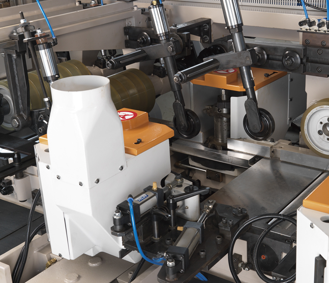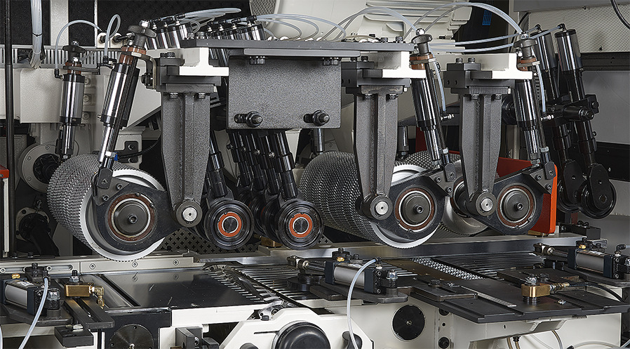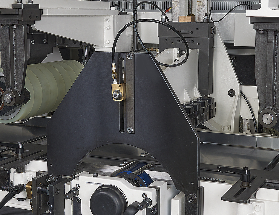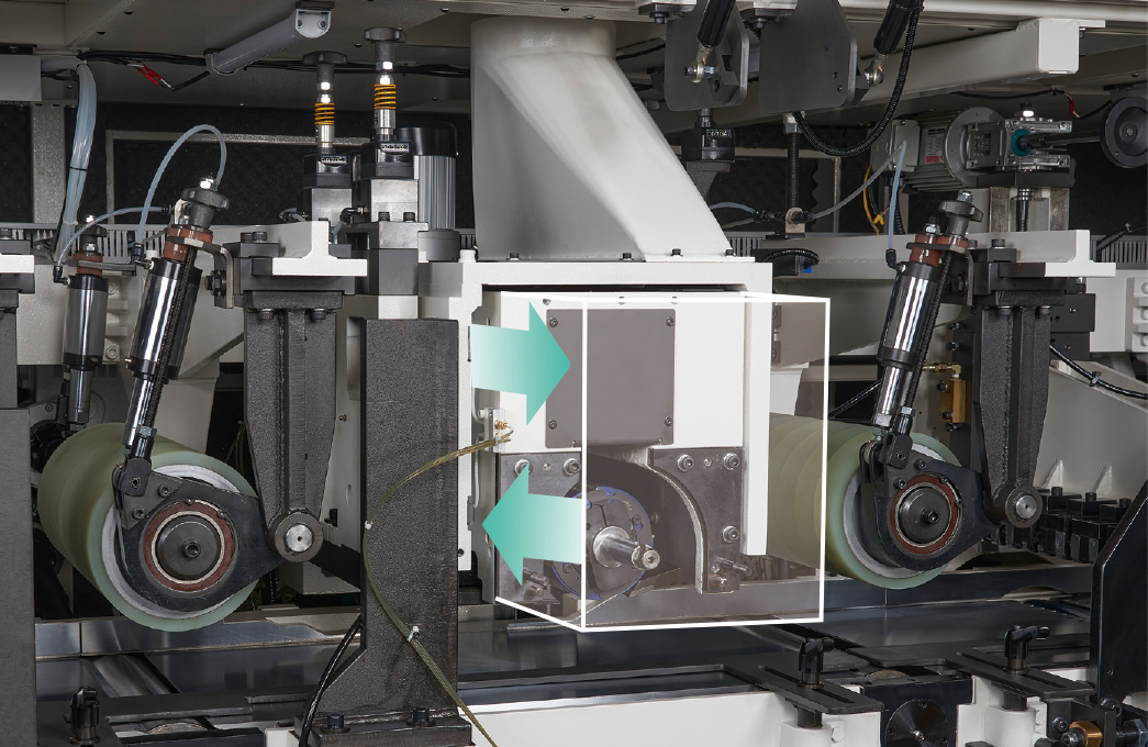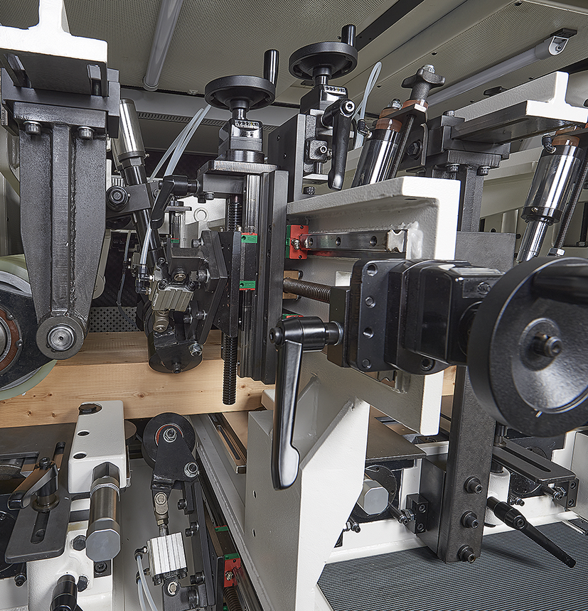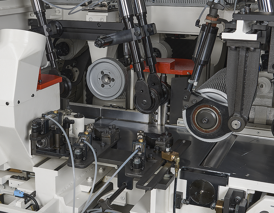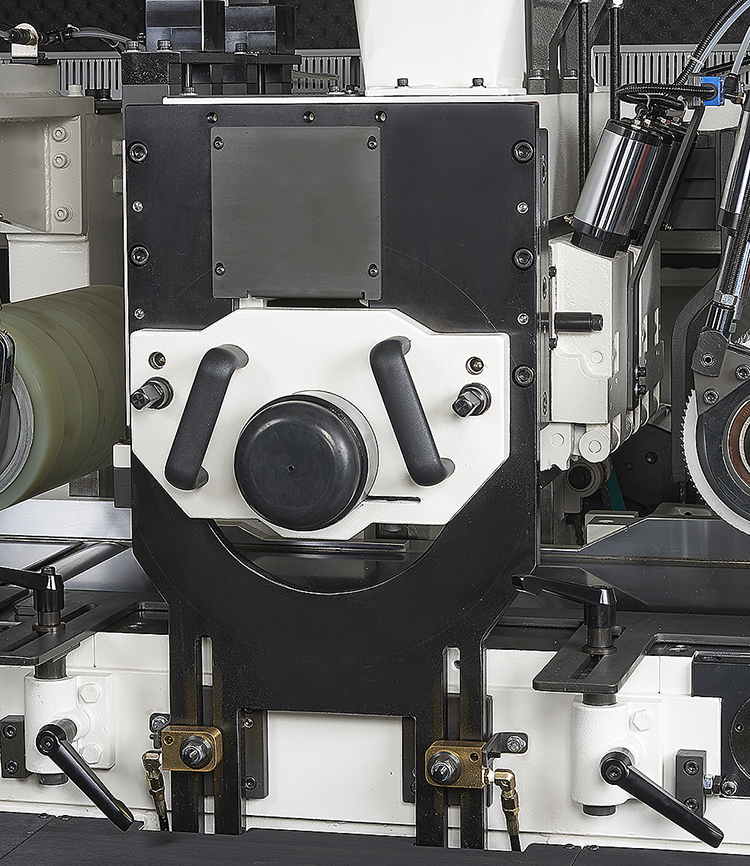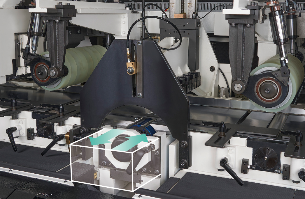 超強的機械結構搭配高速精密主軸及450MM寬送料輪安裝油壓軸外支撐,保證加工時擁有最佳的穩定性。機器上可加裝平面磨刀及成型磨刀裝置,再搭配自動定位系統,提昇操作的方便性和切削的穩定度。